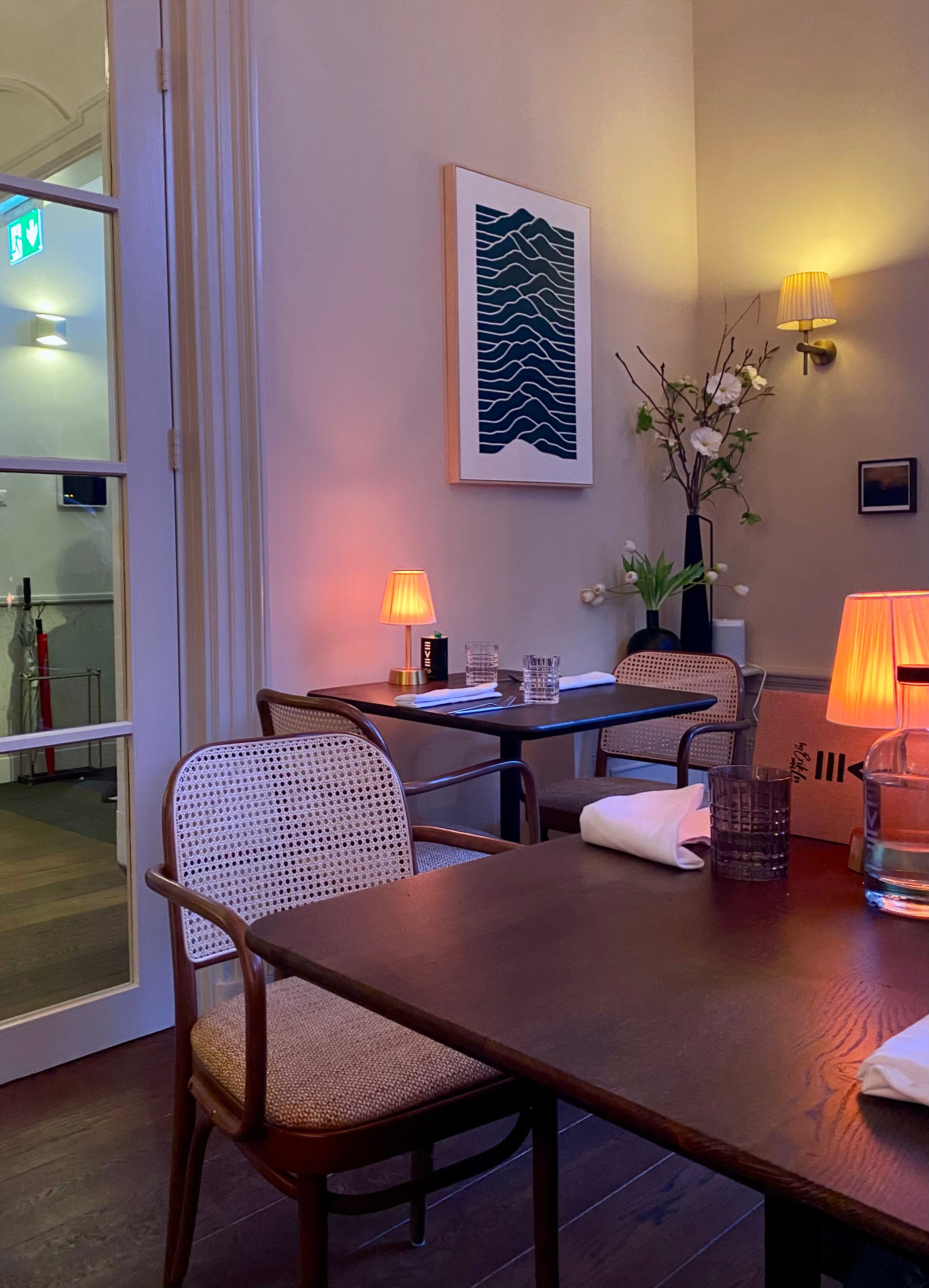 The restaurant is located in a beautiful cloudy blue building from the 18th century. It’s split into two dining rooms and I’m glad we’re led to one with a view of Noordeinde Palace. It’s gorgeous in here. The natural light streams through the tall windows and into the stylishly decorated restaurant, accentuating the calming golden hues and clean lines. It looks refined and yet open. Chic and casual. At this point, I’m already looking forward to coming back.