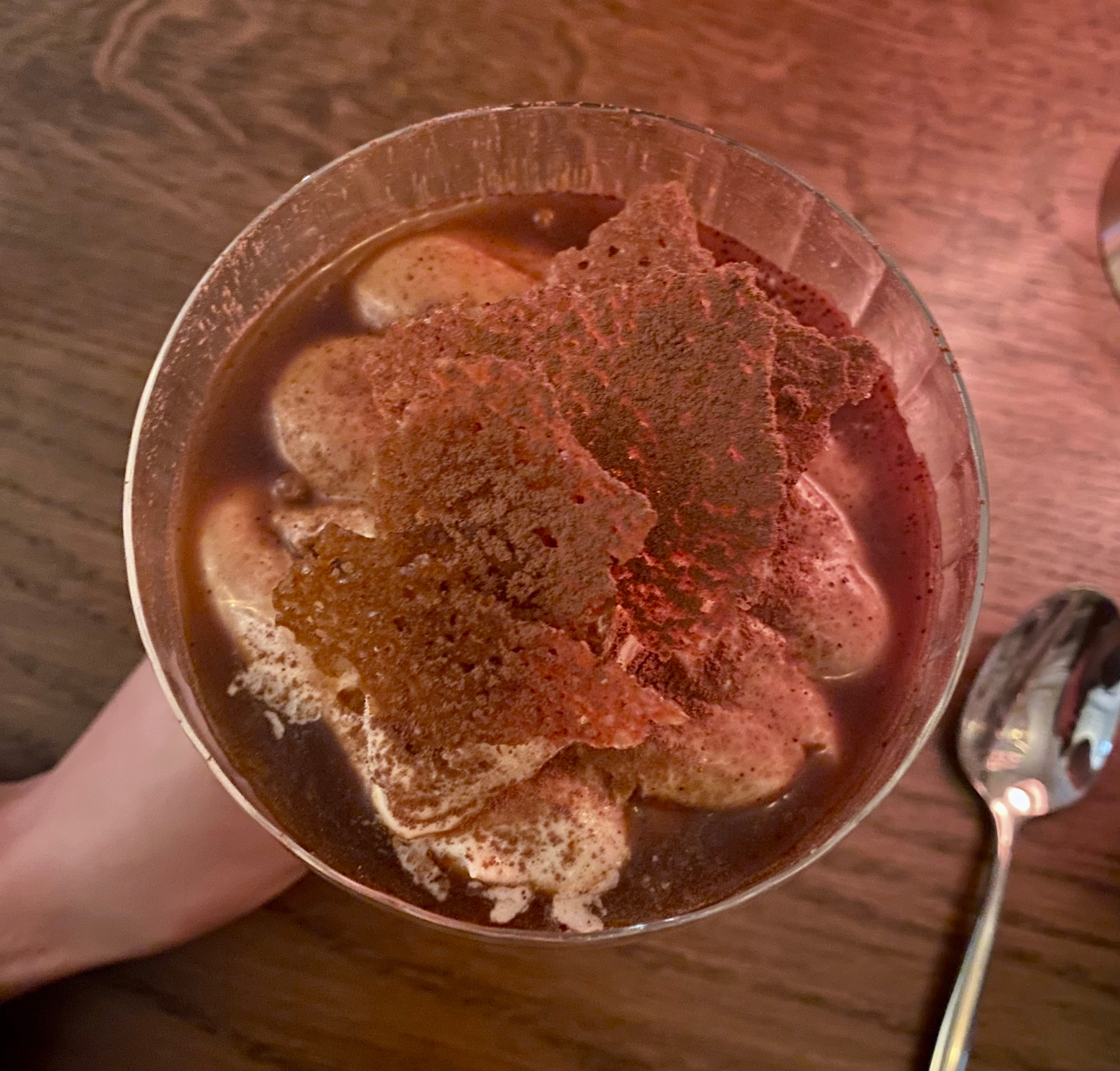 My dining companion gets impatient from the noise and refuses dessert. A shame because the hopjes tiramisu is a highlight. Here, EVE has understood the assignment: modern Dutch cuisine with a spin. It’s executed well with coffee, caramel, and vanilla balancing each other out. I’m relieved that the ladyfingers have long been soaked, leading to a tender bite. The spoon is almost comically large, threatening to tip over the martini glass, but it holds. Despite this awkwardness, the tiramisu is one of the better bites I’ve had all year. I’m impressed.