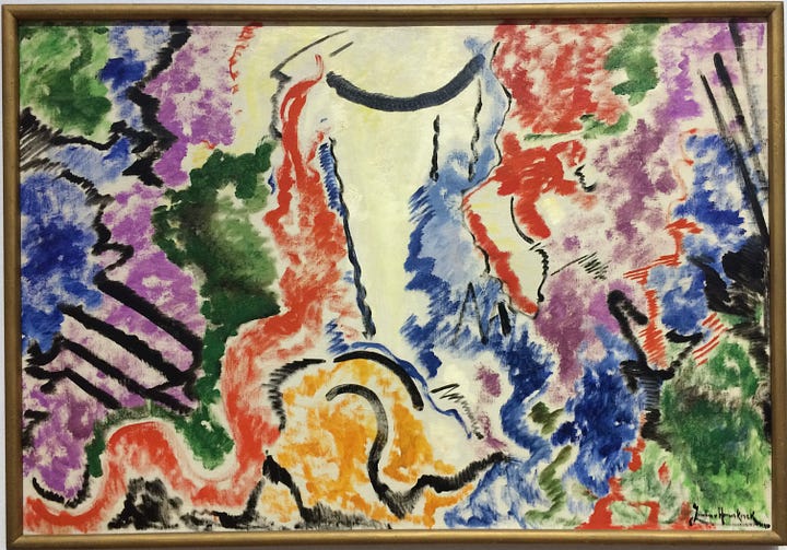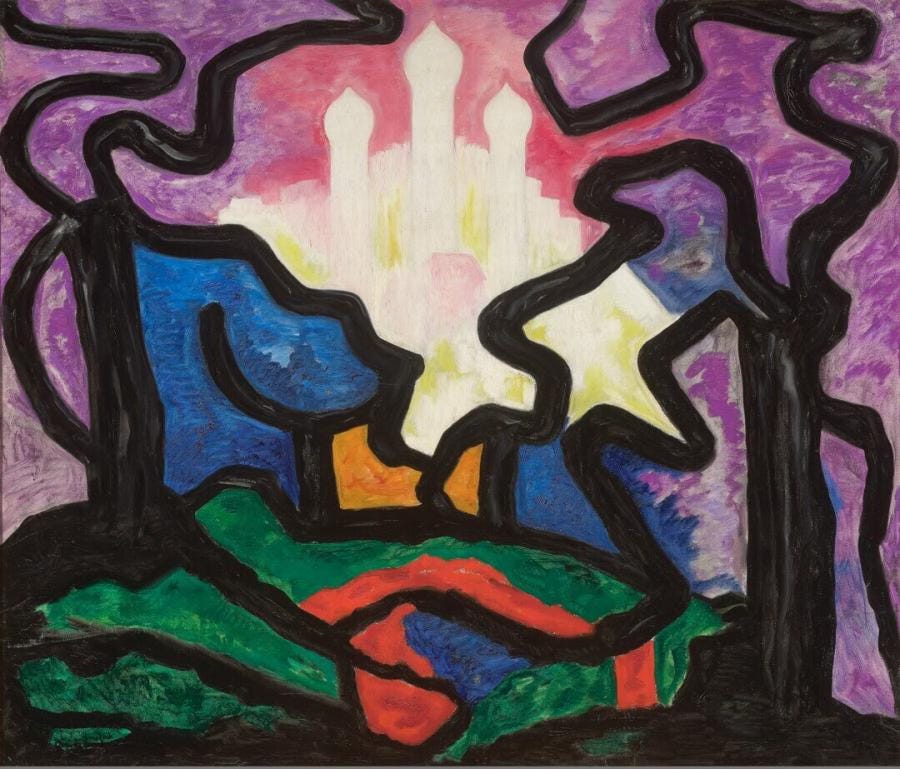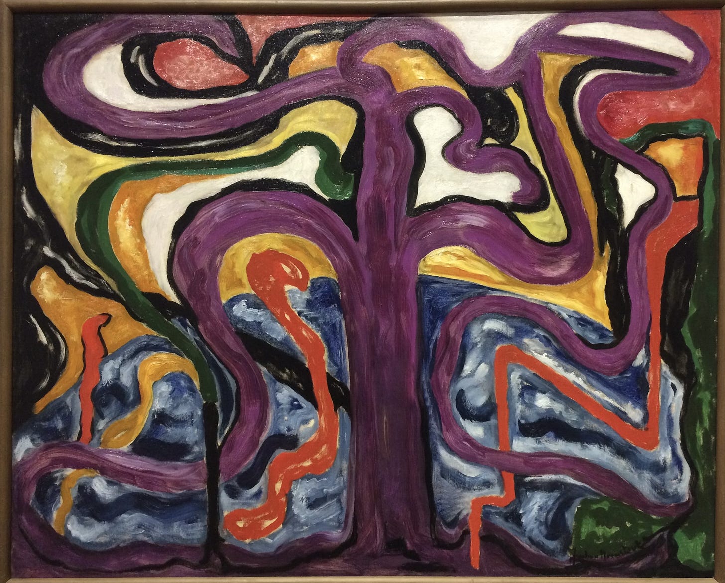 Bild No. 87 (1918) depicts a purple tree with meandering branches at the foreground. The purple branches fill the canvas, nudging the top and while remaining connected to its’ roots at the base. Around the tree, meandering playful lines of mossy greens, burnt oranges, gold, and blacks interplay, suggesting dynamic movement. A hemisphere of marine blues fill the bottom half of the canvas, balanced by lighter golden hues atop. It is a painting of a tree and it is also far from it.