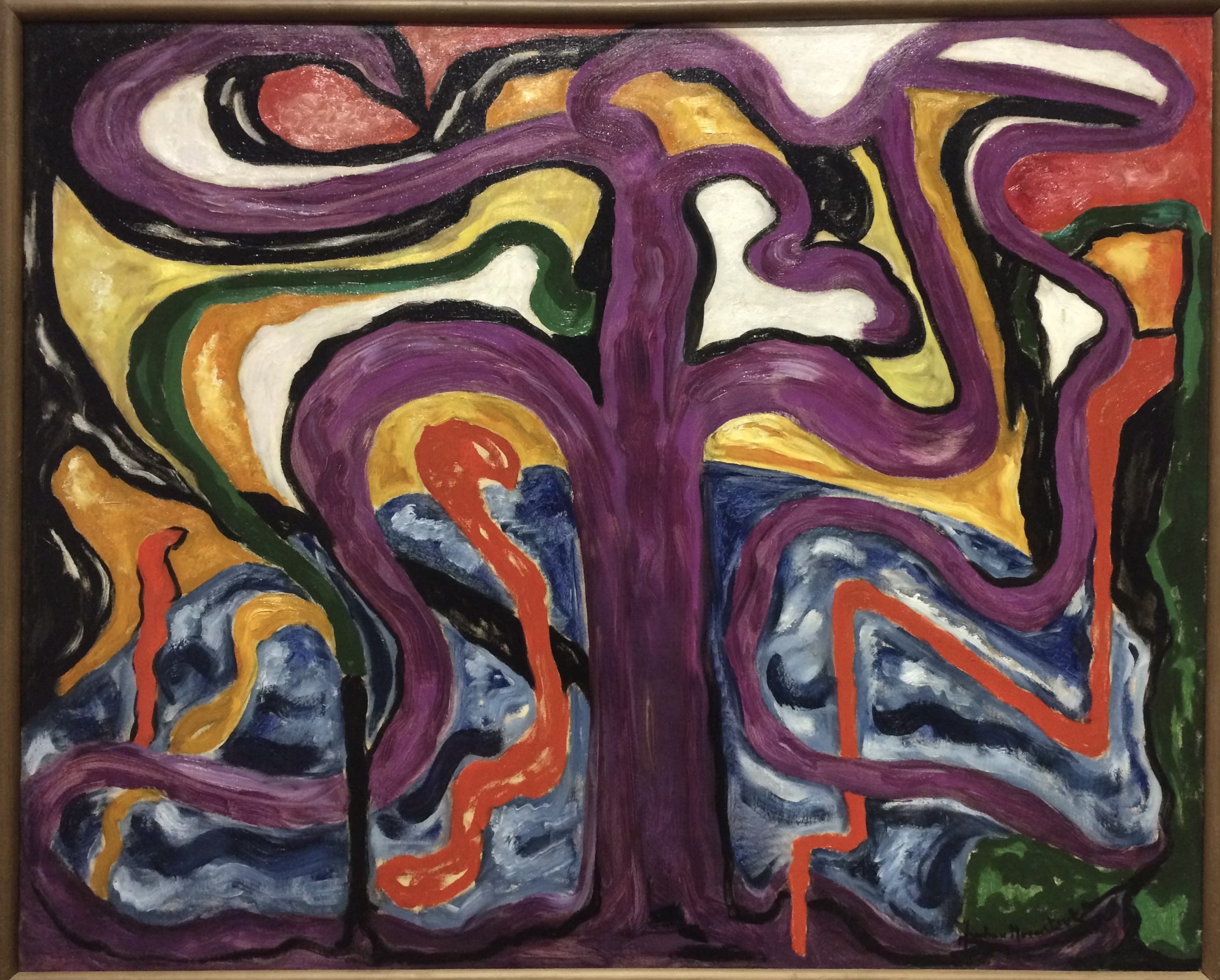 With distinct colours, shapes, and lines, the painting inherently solicits a response — is it an uneasiness? Or does it portray discomfort? Is it primal? What of harmony and spiritual-inclination? It is up to the viewer to decide.