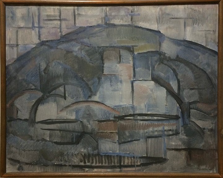 In 1911, Van Heemskerck was exposed to Cubism at an exhibition in Amsterdam. Later at Domberg, she takes lessons with prominent Cubist artist of the time, Lodewijk Schelfhout. Subsequently, her style shifts and she experiments with limited palettes and emphasized geometric forms. Hues of grays and browns begin to take over her canvases, displacing the previous bright hues. The change is striking and Schelfhout would later accuse Van Heemskerck of plagiarizing his style.