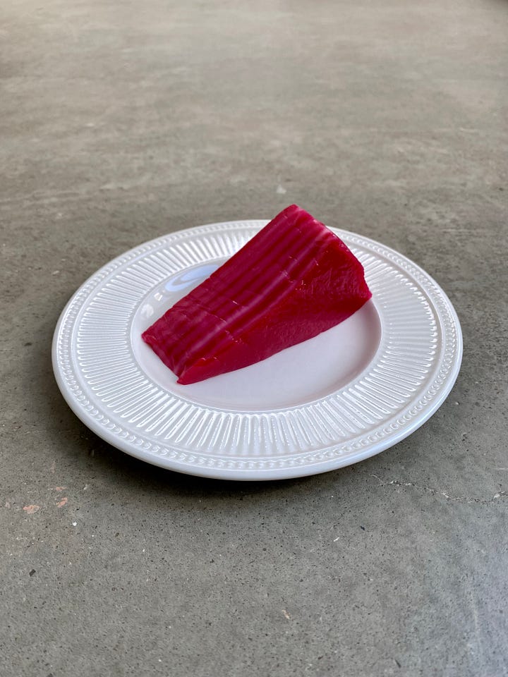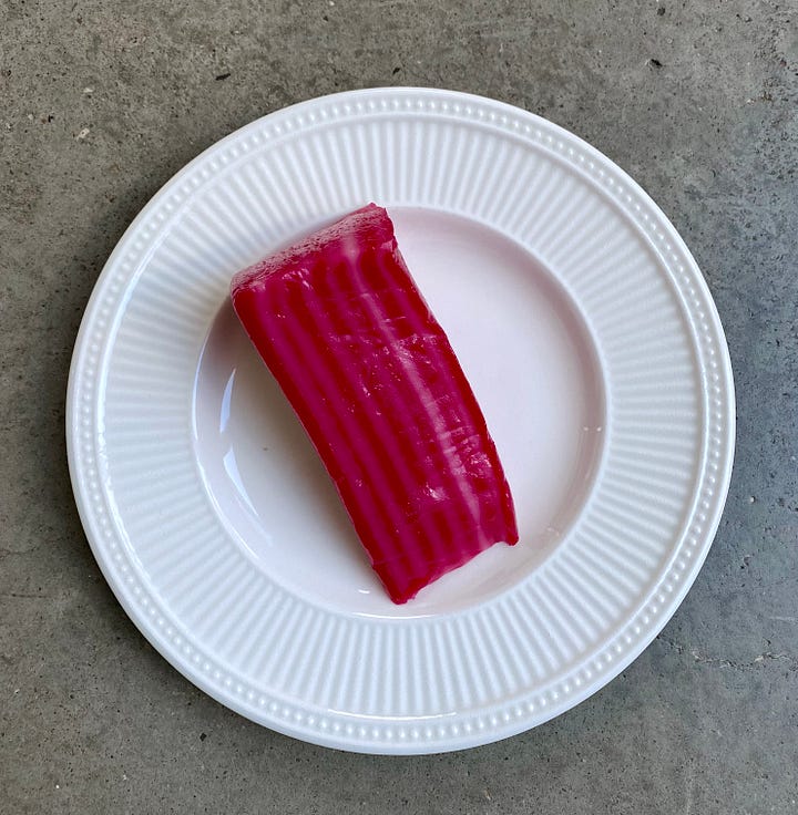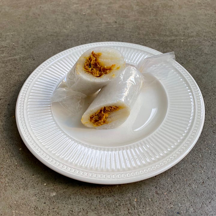 The kue lapis is a multilayered cake made from coconut milk and gluten-free flour. Think baumkuchen meets a less chewy mochi. The vibrant hue is pleasing to the eye and the texture makes it fun to jiggle. The cake carries a lovely coconut milk and pandan aroma. Nitpicking, I most enjoy eating lapis one layer at a time, by peeling back each layer, but the layers stick to one another here. Regardless, the flavour is very very good — mild, sweet, and floral. I’d recommend it to those who are less familiar with Indonesian sweets. Overall, a very good treat.
